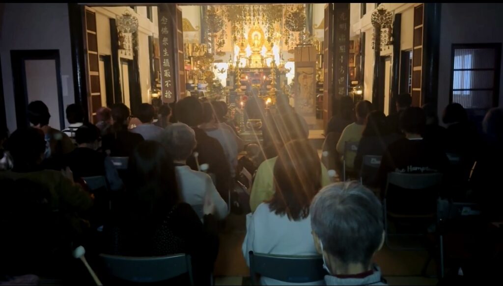 本堂では、別時念仏といい、灯りを落として、1人1つ木魚を持ち、
