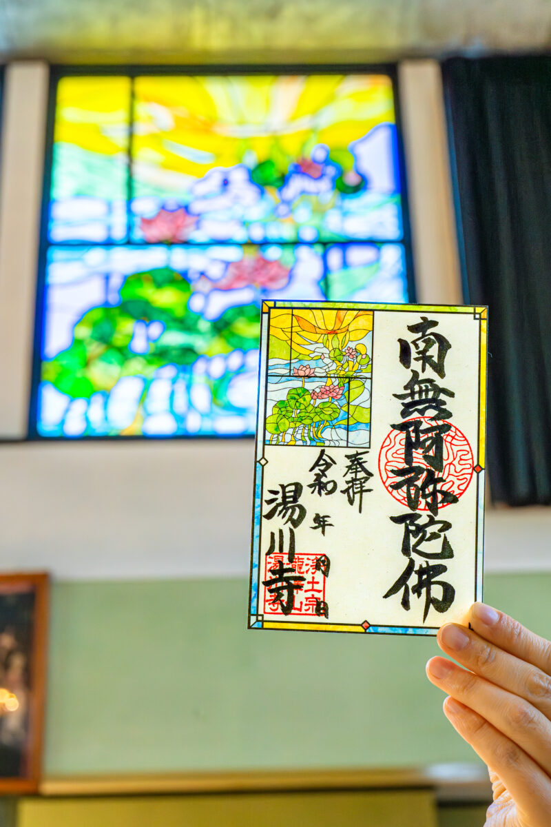 ステンドグラスには蓮と鳳凰が描かれており、御朱印用紙にも同じ絵が入っており、