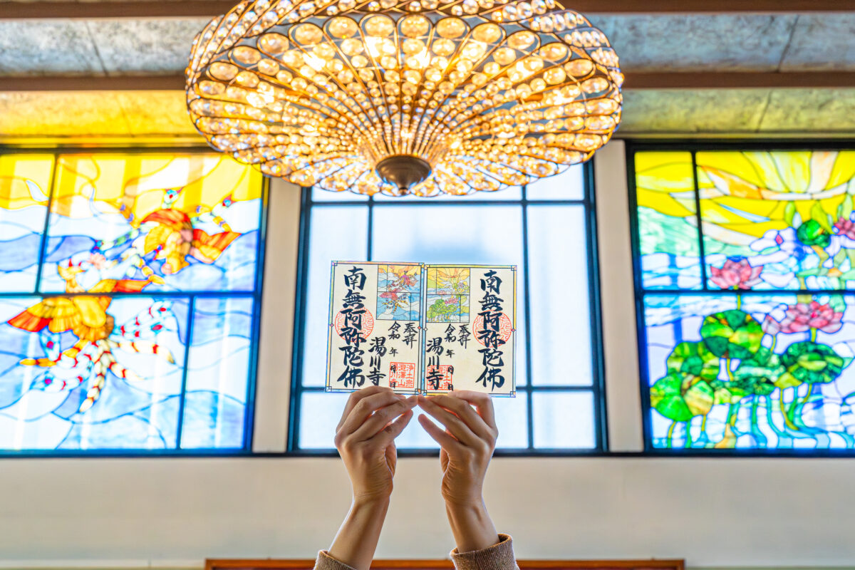 極楽浄土の空というイメージで、窓枠にステンドグラスが入っているのが湯川寺の本堂の特徴です。
