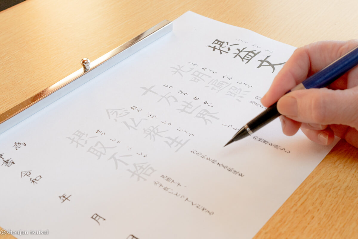 南無阿弥陀仏の六文字を書くだけの写経や短いお経など、好きなものを選んでください。
